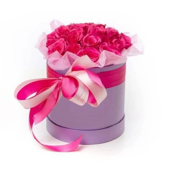The box usually consists of 17 roses; however, depending on the size of blossoms, we may add or take out several flowers for the overall image to look flawless. The box is decorated with a ribbon and a special fabric. The color of the box is chosen randomly but colors are always matched for the composition to look stylish. If you want to choose the box color, contact us by phone or email. The shade of pink roses may differ from the photo.