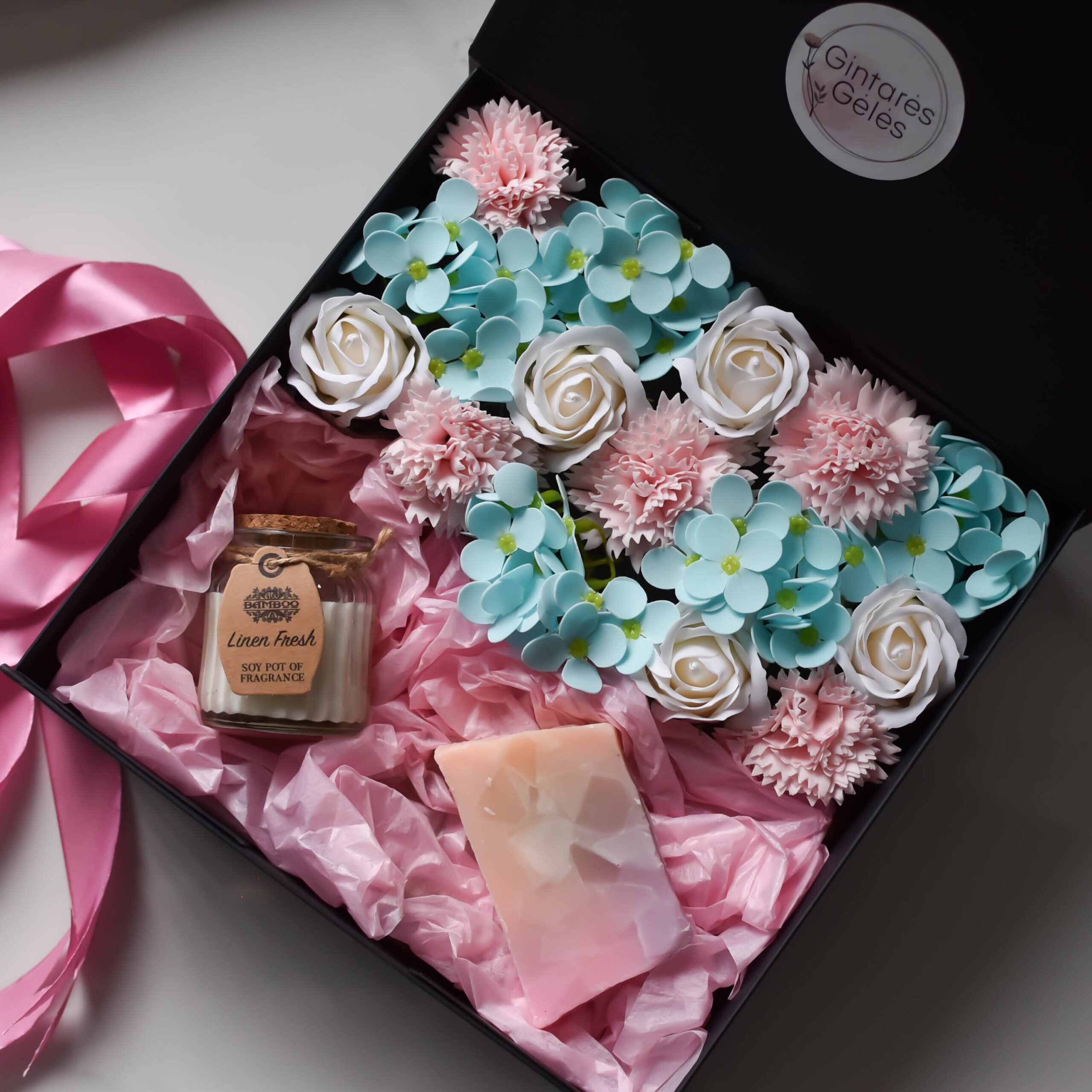 Muilo gėlės – rožytės, chrizantemos ir gvazdikai. Šios kruopščiai pagamintos dekoratyvinės muilo gėlės džiugina akį ir skleidžia švelnų aromatą. Jos puikiai tiks vonios interjerui papuošti ar kaip ilgai išliekantis dėmesio simbolis.