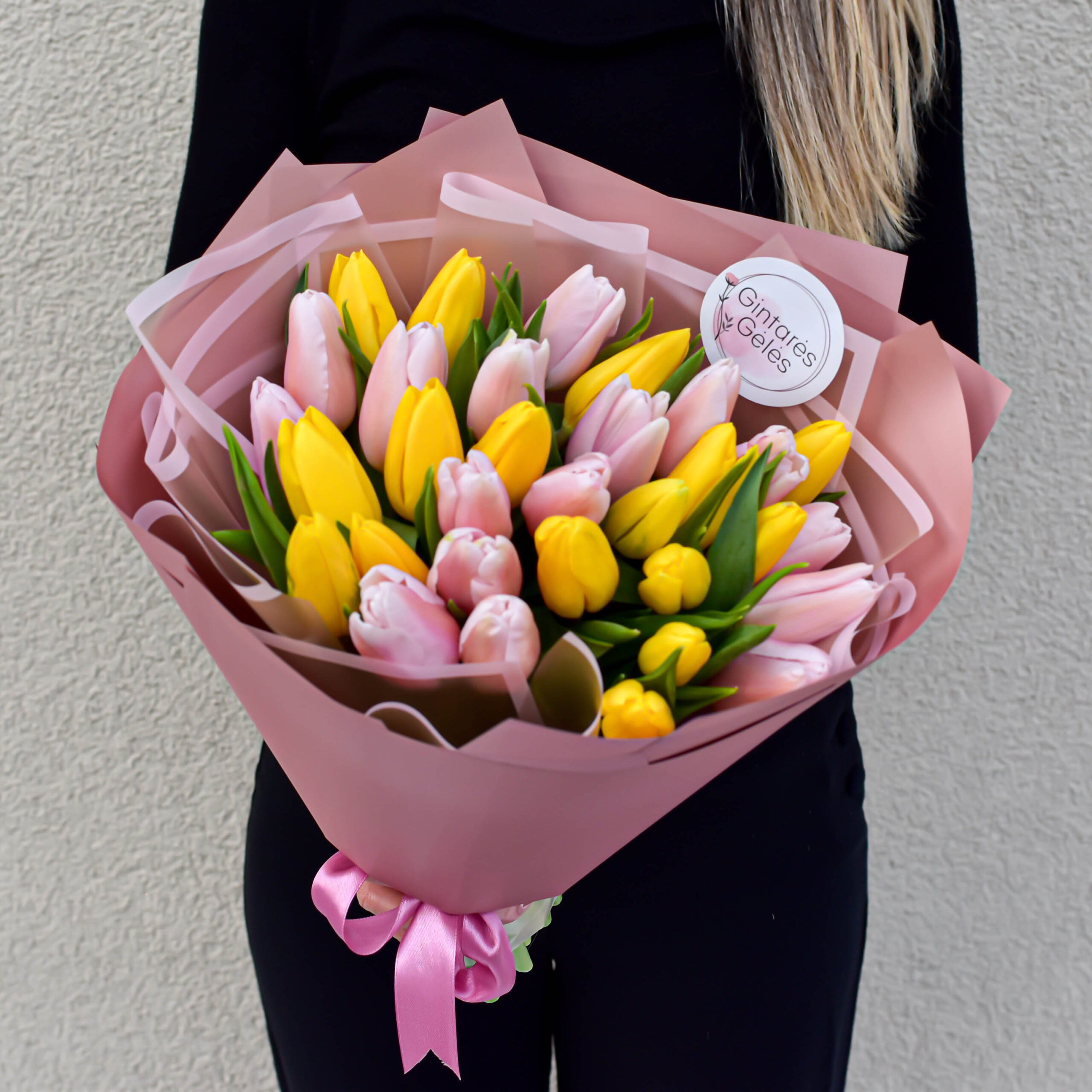 Įneškite į namus spalvų ir pavasarinės energijos! Ši žaisminga geltonų ir rožinių tulpių puokštė sukurta tiems, kurie vertina natūralų grožį ir šviesias emocijas.