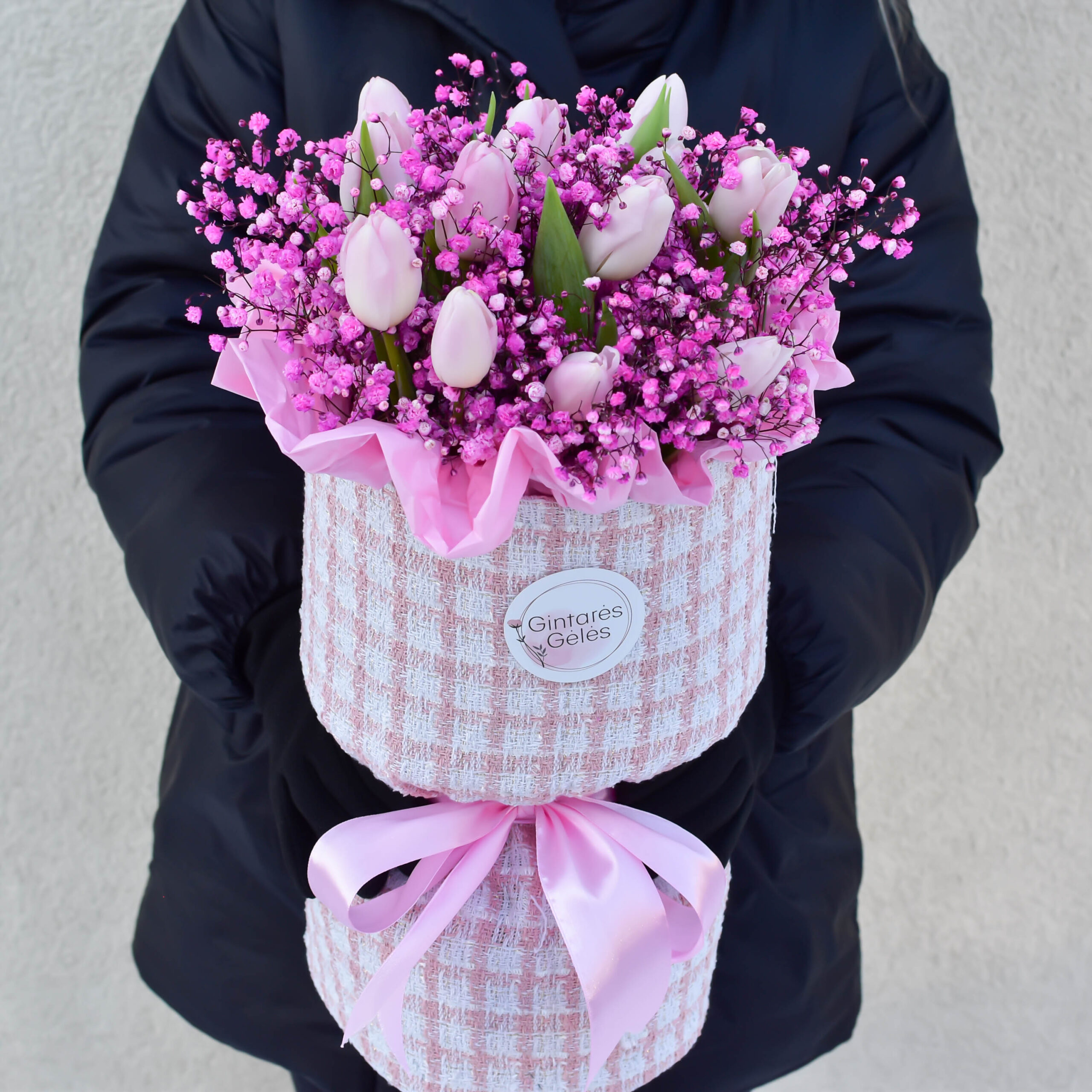 Šviesiai rožinės, pavasariu kvepiančios tulpės čia susipina su žaismingomis, ryškiai rožinėmis gipsofilijomis, sukurdamas akį traukiantį tekstūrų ir spalvų žaismą.